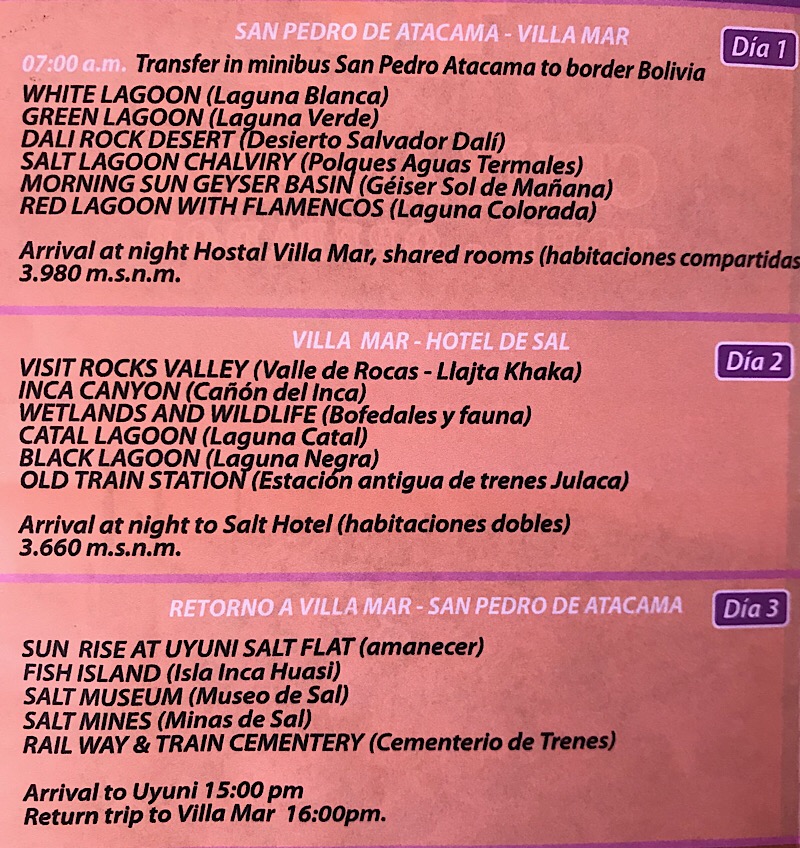 Am Sonntag (2.12.18) starten wir eine dreitägige Tour, die uns zu den berühmten Salar de Uyuni in Bolivien bringt: