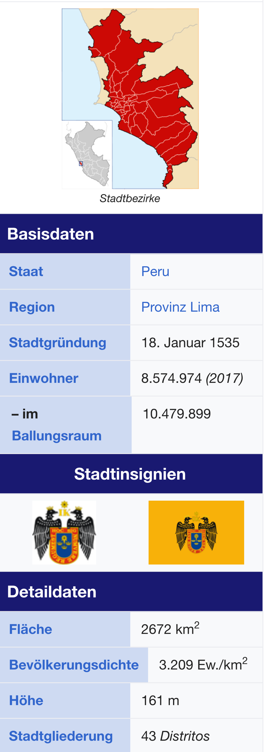 Die Hauptstadt Perus ist eine der grössten Städte Südamerikas. Mit den Ballungsgebieten leben hier um die 10 Millionen Menschen. Die Hauptstadt ist bekannt für ausgezeichnetes Essen. Peruanische Köche sind unter den Besten der Welt.