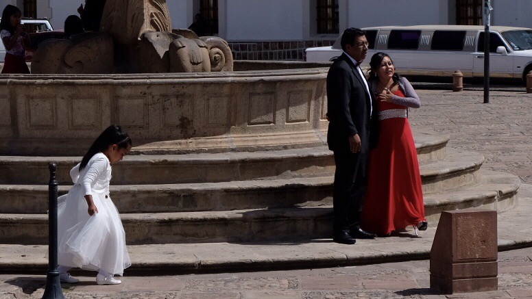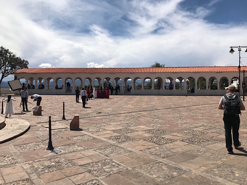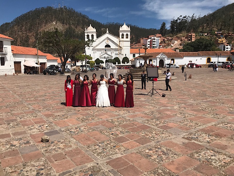 Am Samstag den 8.Dezember steigen wir zum ehemaligen Kloster la Recoleta hoch. Dieses thront auf einem Hügel oberhalb der Stadt und bietet einen wunderbaren Ausblick auf Sucre. Schon als wir die Strassen hochsteigen, treffen wir auf unzählige festlich gekleidete SchülerInnen und Festgemeinschaften mit weissen Blütenblättern in den schwarzen Haaren. Wir denken uns, vielleicht ist heute ein spezieller kirchlicher oder schulischer Festtag. Auch auf dem Platz vor der Kirche tummeln sich Stretch-Limousinen und nicht weniger als drei Hochzeitsgesellschaften halten hier ausgedehnte Video- und Fotoshootings. Später erfahren wir dann, dass der Grund für die vielen Hochzeiten darin liegt, dass das Datum (8.12.2018) sich gut durch 2 teilen lässt und dies in bolivianischer Denkweise Glück für die Jungvermählten verspricht.
