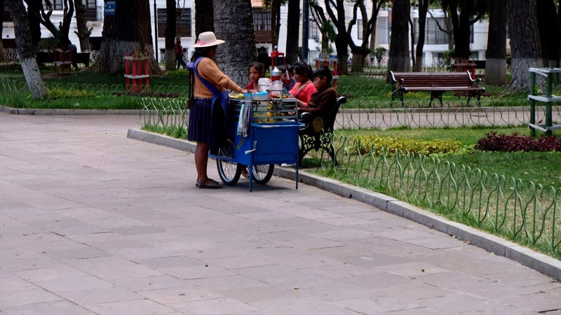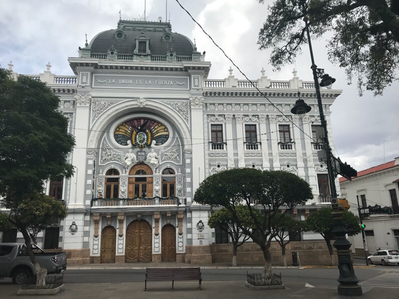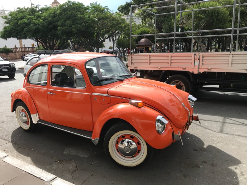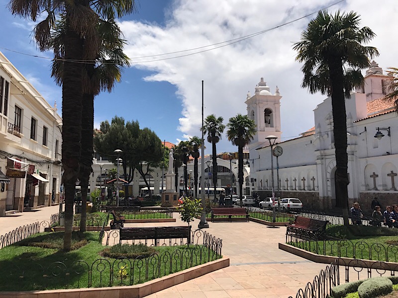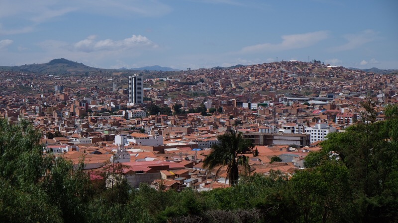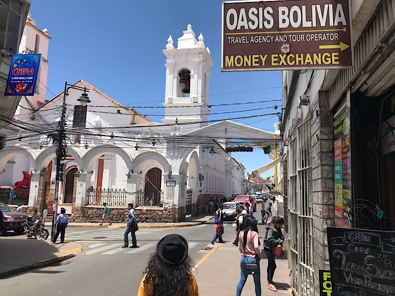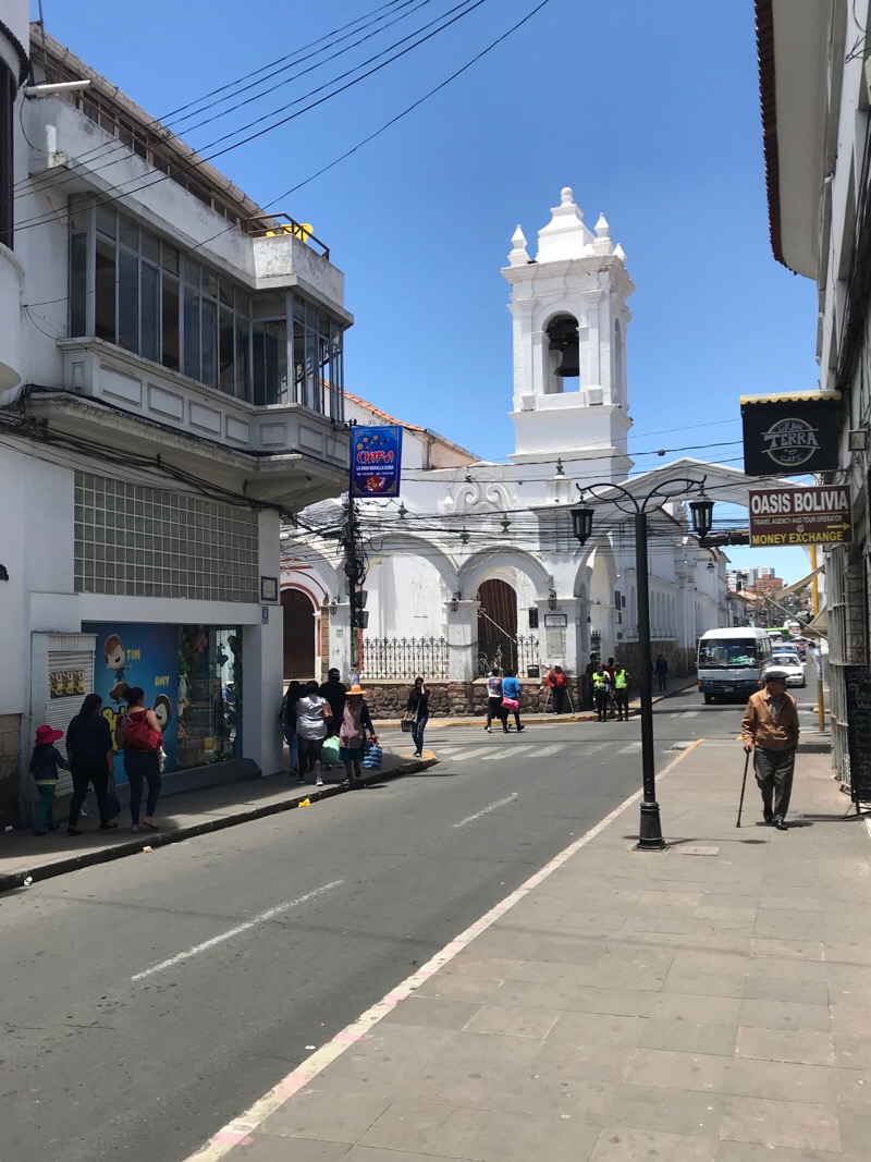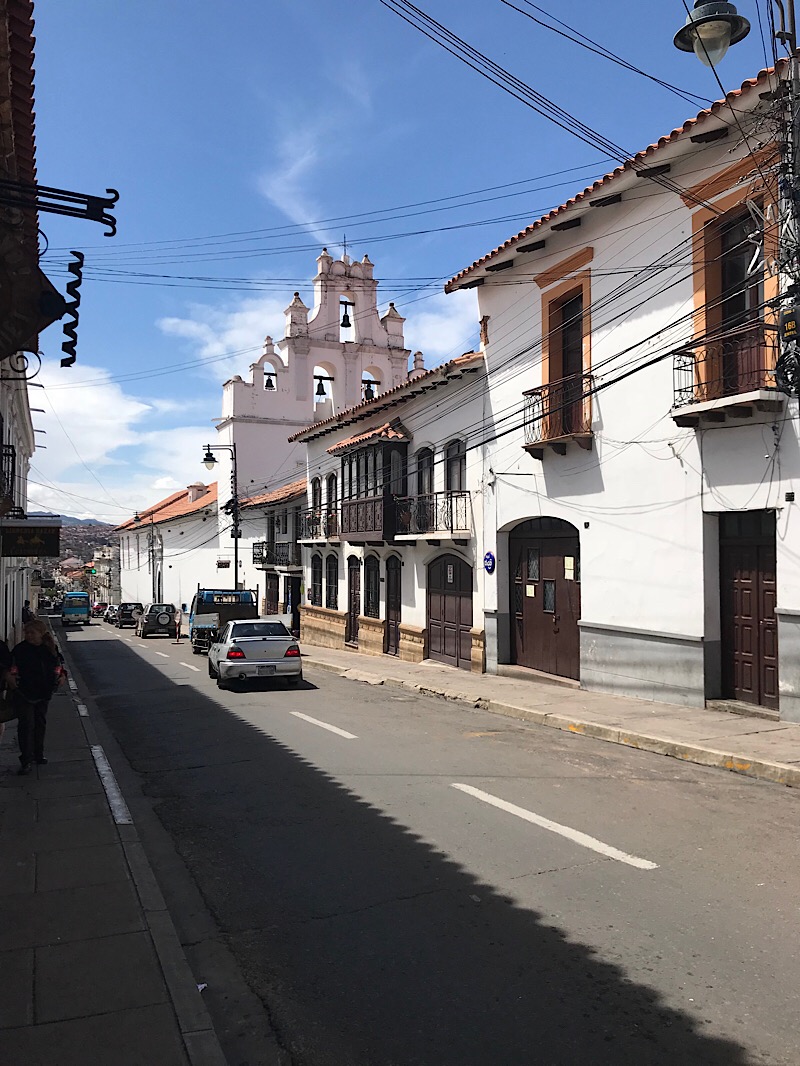 Von hier aus unternehmen wir verschiedenste Dinge. Einerseits steht natürlich das schon fast zur Tradition gewordenen „Callejar“ auf dem Programm. Sucre ist eine schmucke Stadt. Sie besitzt viele Kirchen und Gebäude aus der Kolonialzeit. Fast alle Häuser des Stadtzentrums sind weiss getüncht. Dies ergibt zusammen mit dem oft stahlblauen Himmel ein fotogenes Ensemble. Leider hat die Stadt ziemlich viel Verkehr, der sich durch die engen Gassen drängt und die wenigsten der Motoren scheinen vernünftige Abgaswerte zu haben. Jedenfalls staut sich in den Gassen zu Stosszeiten das Abgas und macht unseren durch klare Höhenluft verwöhnten Näschen und Lungen ganz schön zu schaffen.