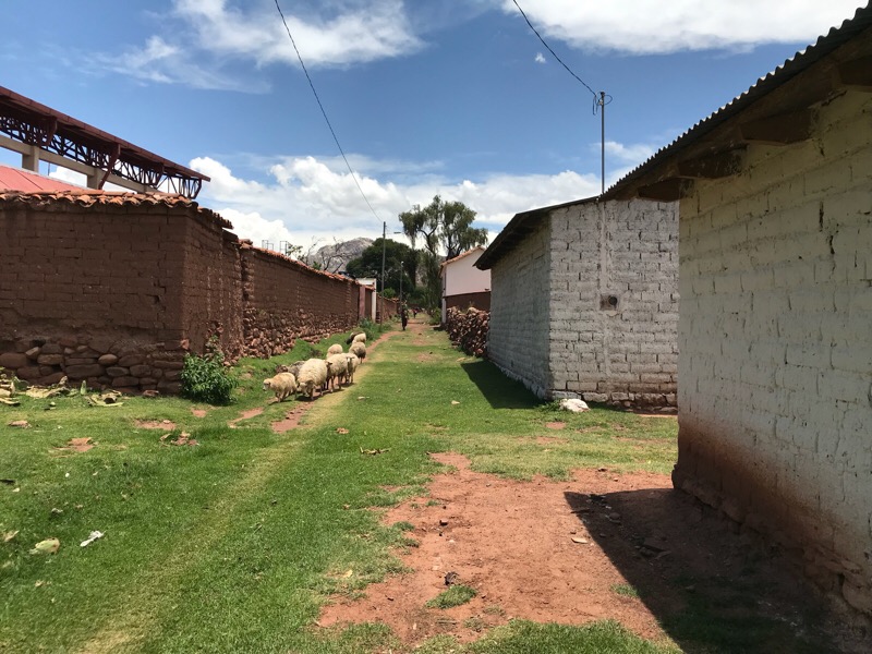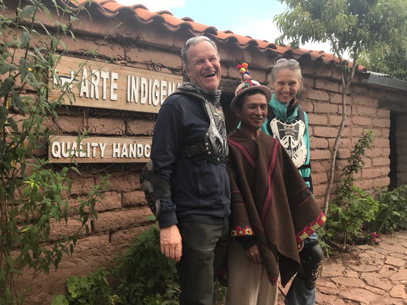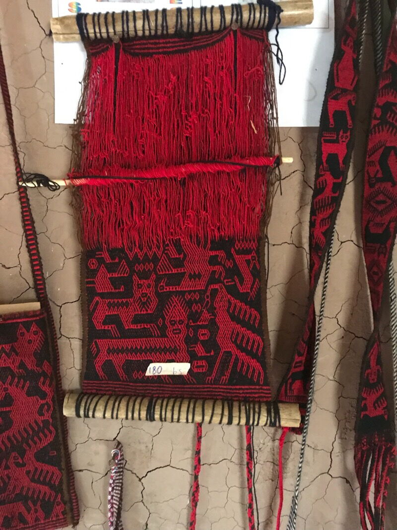 Crispin ist sogar im Begriff ein kleines Museum aufzubauen, das als zentrale Ausstellungsstücke Webereien seiner Mutter zeigt. Und diese sind, jetzt schliesst sich der Kreis unserer Begegnungen mit der Web-Kunst der Indigenos, noch aus der Zeit, bevor sich die Muster der Jalq’a zu Gunsten des Tourismus verändert haben. Sie zeigen noch die ursprünglichen, undefinierten Bewohner der Unterwelt und keine Kondore und Llamas, wie das Armband, das wir auf dem Markt von Tarabuco erworben haben.