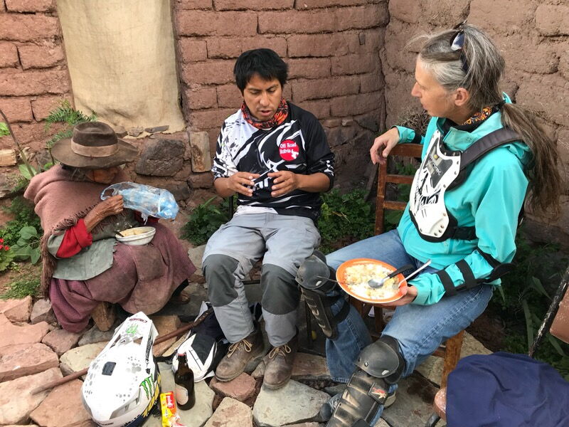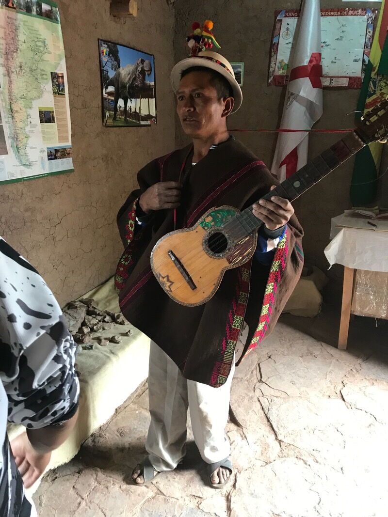 Henry hat auf dieser Strecke Freunde. Diese besucht er spontan, da eine Voranmeldung via Natel nicht möglich ist. Er bringt ihnen als Gastgeschenk Dinge vom Markt in Sucre, die sie nicht selbst produzieren, aber gerne essen. So ist zum Beispiel Geissenkäse ein begehrter Leckerbissen. Wir fahren also einfach bei den befreundeten Familien vorbei und schauen, ob jemand zu Hause ist. Bei Crispin und seiner schon betagten Mutter haben wir Glück. Crispin ist ein herzensguter Mensch. und er hat richtig Freude daran, Menschen zu begegnen. Er lädt uns zum Essen ein, schenkt uns Früchte aus seinem Garten, zeigt uns Ausgrabungen die er gemacht hat und zieht extra seine Tracht an und spielt seine Musik, die er zu Karnevalsanlässen mit Freunden aus der Nachbarschaft intoniert. Mit der spontanen Aufforderung, doch mit Gitarre und Trommel einfach mitzutun, sind wir zwar leicht überfordert.