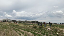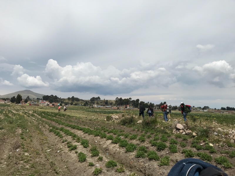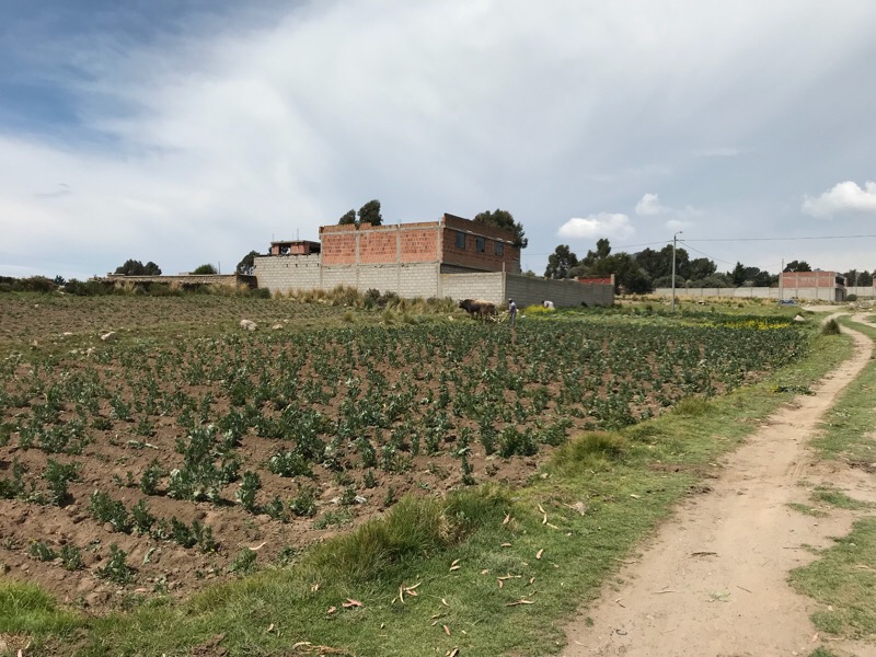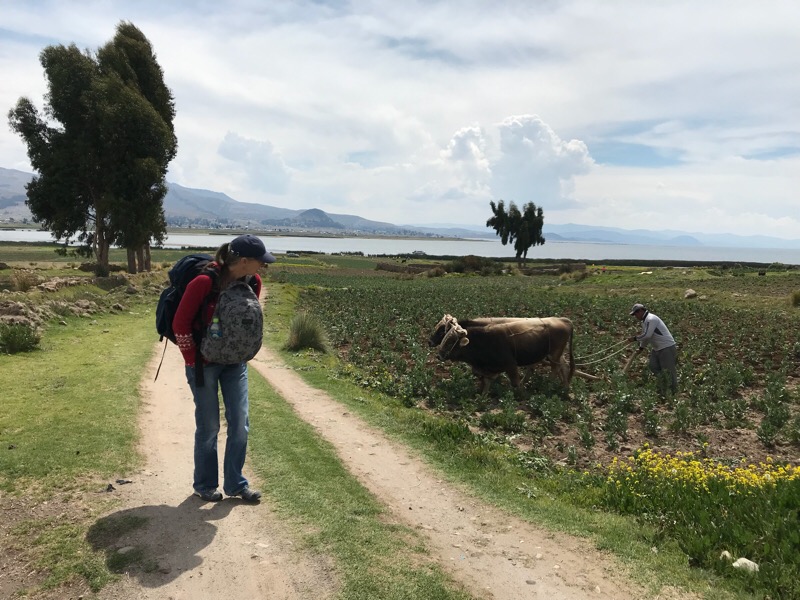 Und jetzt stehen wir wieder einmal inmitten der Pampas, am Rande eines Feldes und wissen nicht wohin. Zum Glück gibt es immer auch andere Reisende in der gleichen Situation. So versuchen wir in unserem Basic-Spanisch Informationen über die Lage und Entfernung der Grenzposten zu erlangen und „lemmingen“ mal vorläufig den anderen Reisenden über einen Trampelpfad hinterher. Auf dem Marsch Richtung Zivilisation (zum Glück gab es Kartoffelstock zum Mittagessen) stellt sich dann heraus, dass die anderen Reisenden Peruaner sind, die keinen Ausreisestempel der bolivianischen Grenzbehörde benötigen. Wir müssen also als einzige der Gruppe zuerst mal beim bolivianischen Grenzposten auschecken und danach beim peruanischen einchecken. Wir fragen uns also zu zweit durch, wandern an einem Bauern vorbei, der mit einem Holzpflug und zwei Ochsen sein Feld bestellt, erreichen nach circa 1km Fussmarsch die Gemeinde. Wir biegen um die erste Ecke und hier sehen wir tatsächlich in der Ferne einen Titicaca-Bus stehen. Wir legen einen Zahn zu, um den Busfahrer über unsere Mitfahr-Absicht zu unterrichten, damit er den Grenzposten nicht ohne uns verlässt. Bevor wir aber entspannt in die Sitze des Busses gleiten können, müssen wir die Grenzformalitäten erledigen. Wir hetzen also zum nächstgelegenen Zollhaus und weisen unsere Pässe vor. Der Zollbeamte sieht die Pässe durch, schaut uns an, blättert wieder und will partout keinen Stempel in die Dokumente knallen. Wir versuchen ihm zu erklären, dass wir wegen des Streiks mit dem Boot über den See gekommen sind und deswegen den Bus, der, draussen mit laufendem Motor steht nicht verpassen möchten. Der Zöllner schaut uns irgendwie seltsam lächeln an und sagt uns, dass wir trotzdem zuerst die Ausreisebestätigung aus Bolivien benötigten.