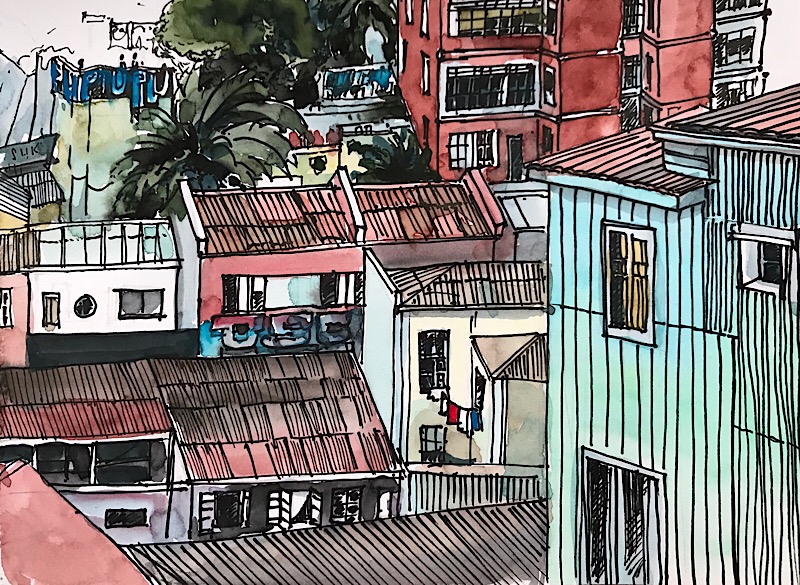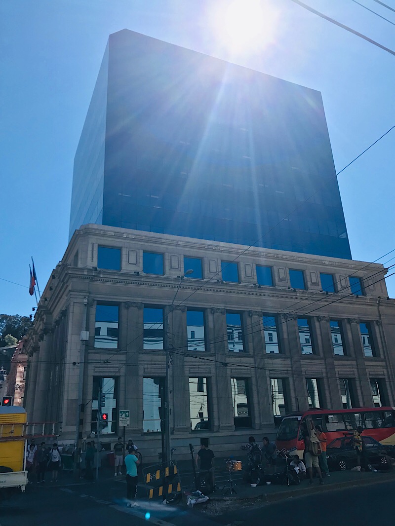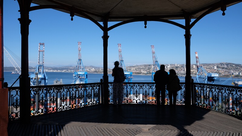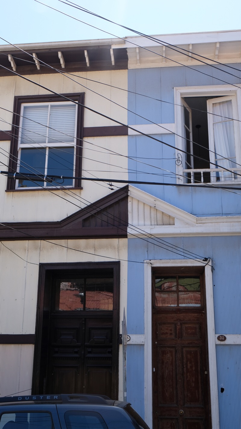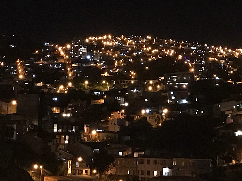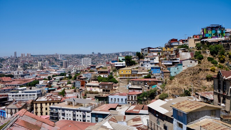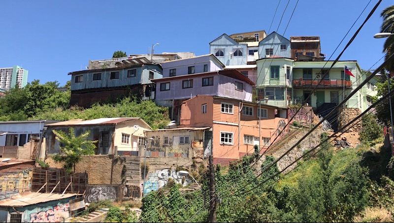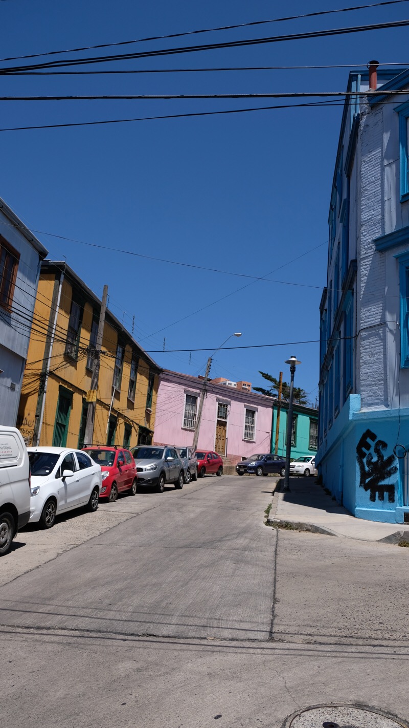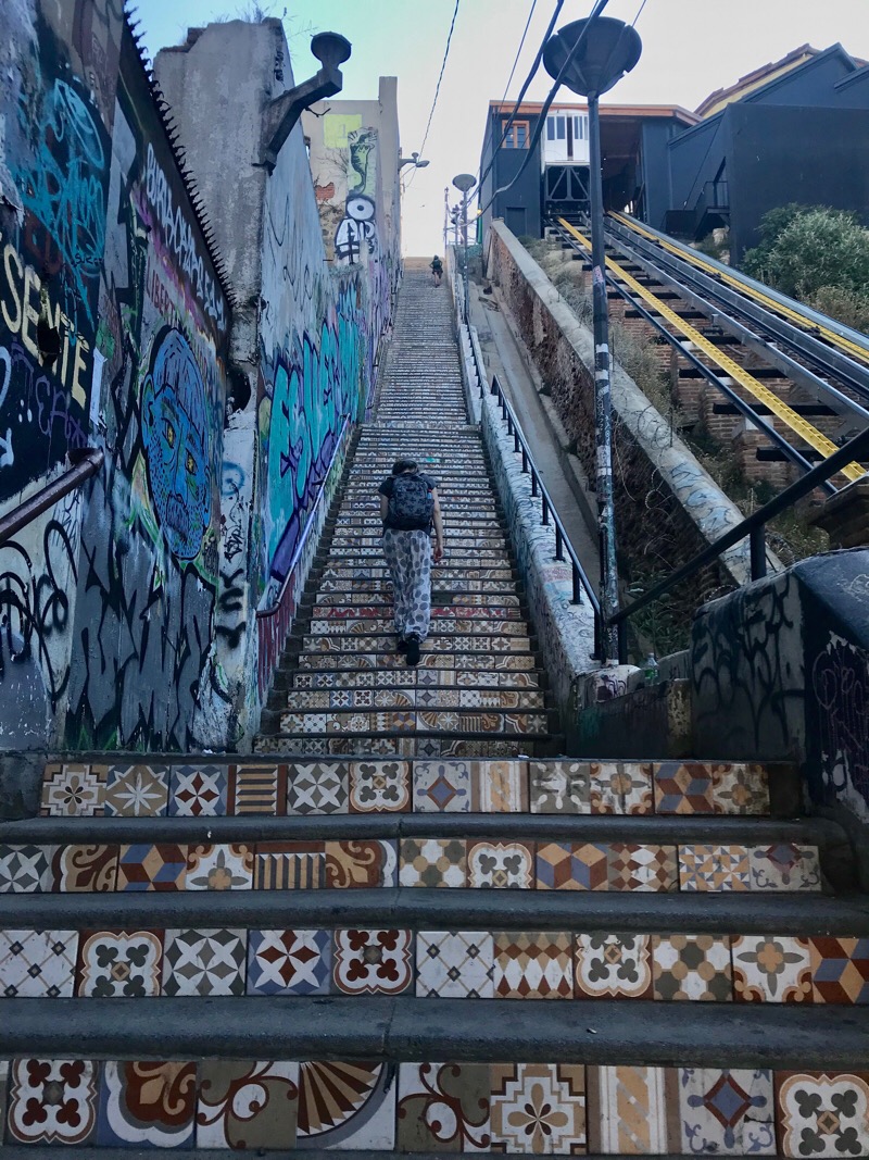 Valparaiso kletterte ausgehend von ihrem Ursprung, dem Handelshafen, über die Jahrzehnte langsam die sie umgebenden Hügel hoch. Heute hat die Stadt circa 252 000 Einwohner. Ihre Bauten erstrecken sich über 42 Hügel und bilden ein wildes und ungezügeltes Gewirr von Gassen, Häusern, Hütten, kleinen Plätzen und Durchgängen. Strassen, Gässchen, Treppen, historische Lifte und Bahnen von abenteuerlicher Steigung erschliessen die übereinander gestaffelten und wild ineinander verstrickten Gebäude. Hochhäuser gibt es nur wenige, dafür um so mehr ein- zwei- oder dreistöckige Gebäude. Neues gedeiht neben Zerfallendem; alternative Kultur, erschliesst sich die alte militärische Exerzier-Kaserne. Graffitikünstler kennen hier keine Grenzen. Alles ist farbig bemalt. Tausende von Werken bedecken fast jede! irgendwie erreichbare Fläche. Von riesigen, über mehrerer Stockwerke reichenden Wandgemälden, bis zu Kleinst-Kunstwerken auf Kandelabern oder Wasserhydranten, auf Gehsteigen, Treppenabsätzen, Bauzäunen.